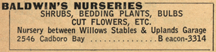 Baldwin's Nurseries 2546 Cadboro Bay Road (19441946 phone books) 2545 Cadboro Bay Road (19471949 phone books) |