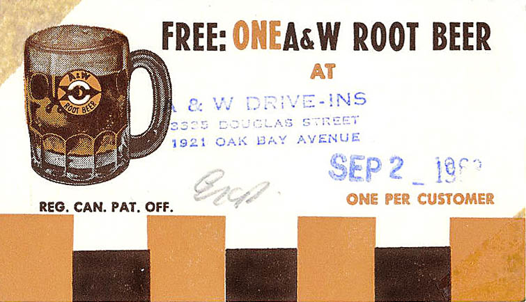 | How many times did I drive into that Oak Bay A&W for a "small orange and a baby burger"? It was usually all I could afford on my measly allowance. Someone usually ordered a "Swamp Water" or that ugly mixture of milk and root beer. The name eludes me. Jungle Juice? |