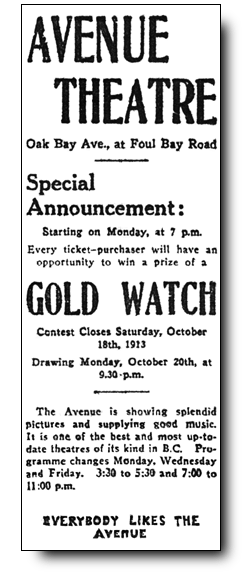 | The Avenue Theatre, built in 1913, was the first theatre in Victoria built specifically for the viewing of motion pictures. It was a dedicated film theatre. Most theatres of the day were stage theatres that would put up a screen and bring in a projector if a film was to be shown. |