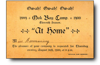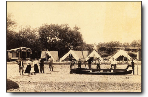 In the late 1880s, eight enterprising young men conceived the idea to build a summer camp not just for themselves, but also for guests on special occasions. The campsite consisted of individual tents for the campers and a kitchen complete with cooking range and Chinese cook! The Camp's annual "At Home" gala became an Oak Bay tradition, with hundreds of invited guests dancing on the beach and sailing in lantern-lit boats on the bay.