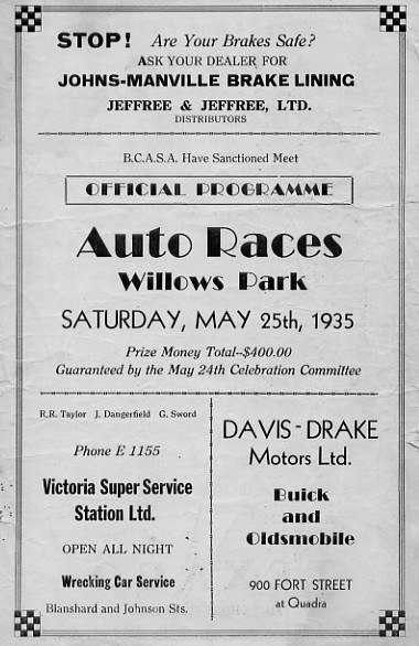 | In 1906, the year Oak Bay incorporated, there were less than a dozen automobiles in Victoria. But sales soon soared as the fledgling automobile industry promoted car clubs, rallies and sporting events. Willows Speedway, on the old Willows Fairground, started around 1912. | |||